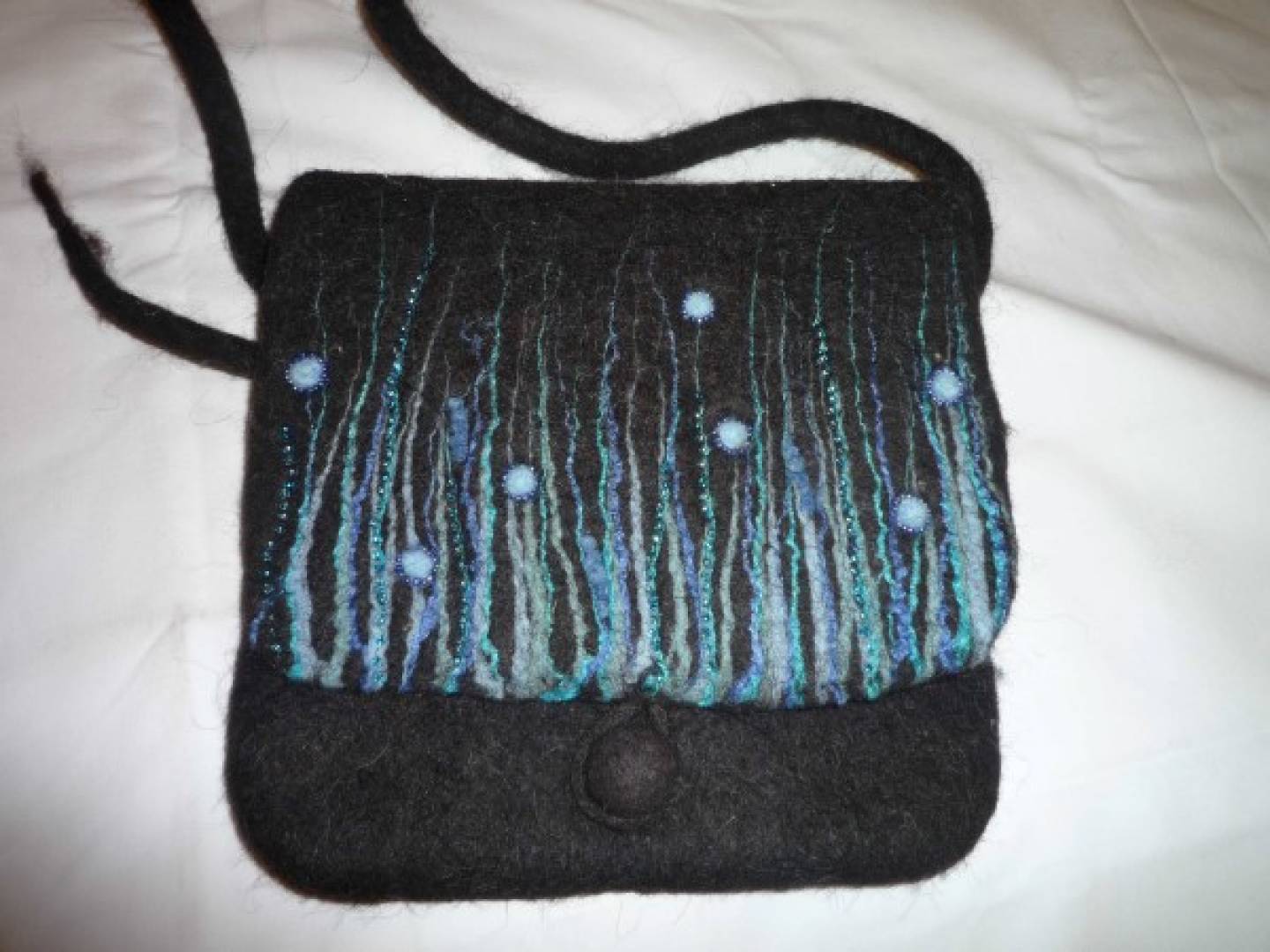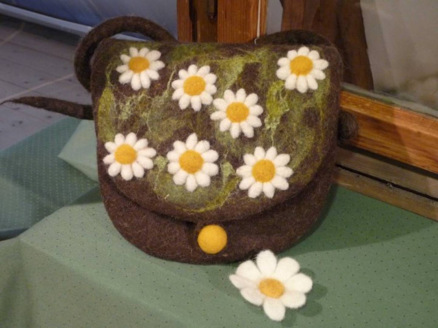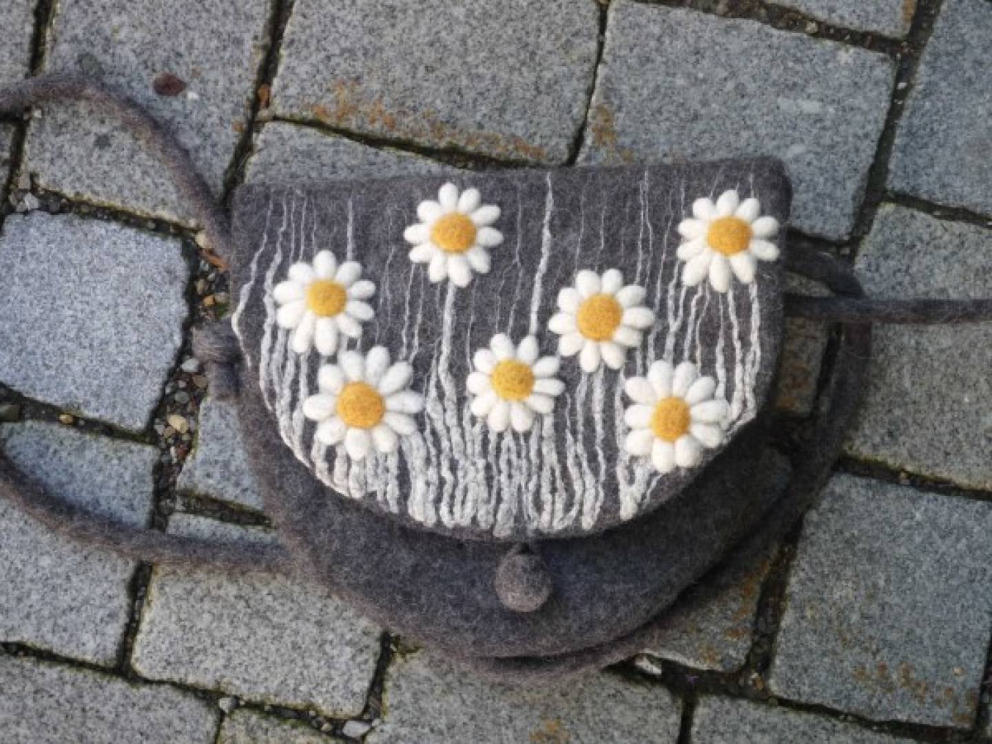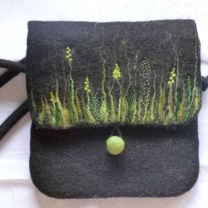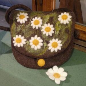 Meist aus heimischer Bergschafwolle filze ich Handtaschen, Sitzkissen, kleine Bilder zur individuellen Gestaltung von Kleidung oder Gebrauchsgegenständen, Dekoration fürs eigene Heim.