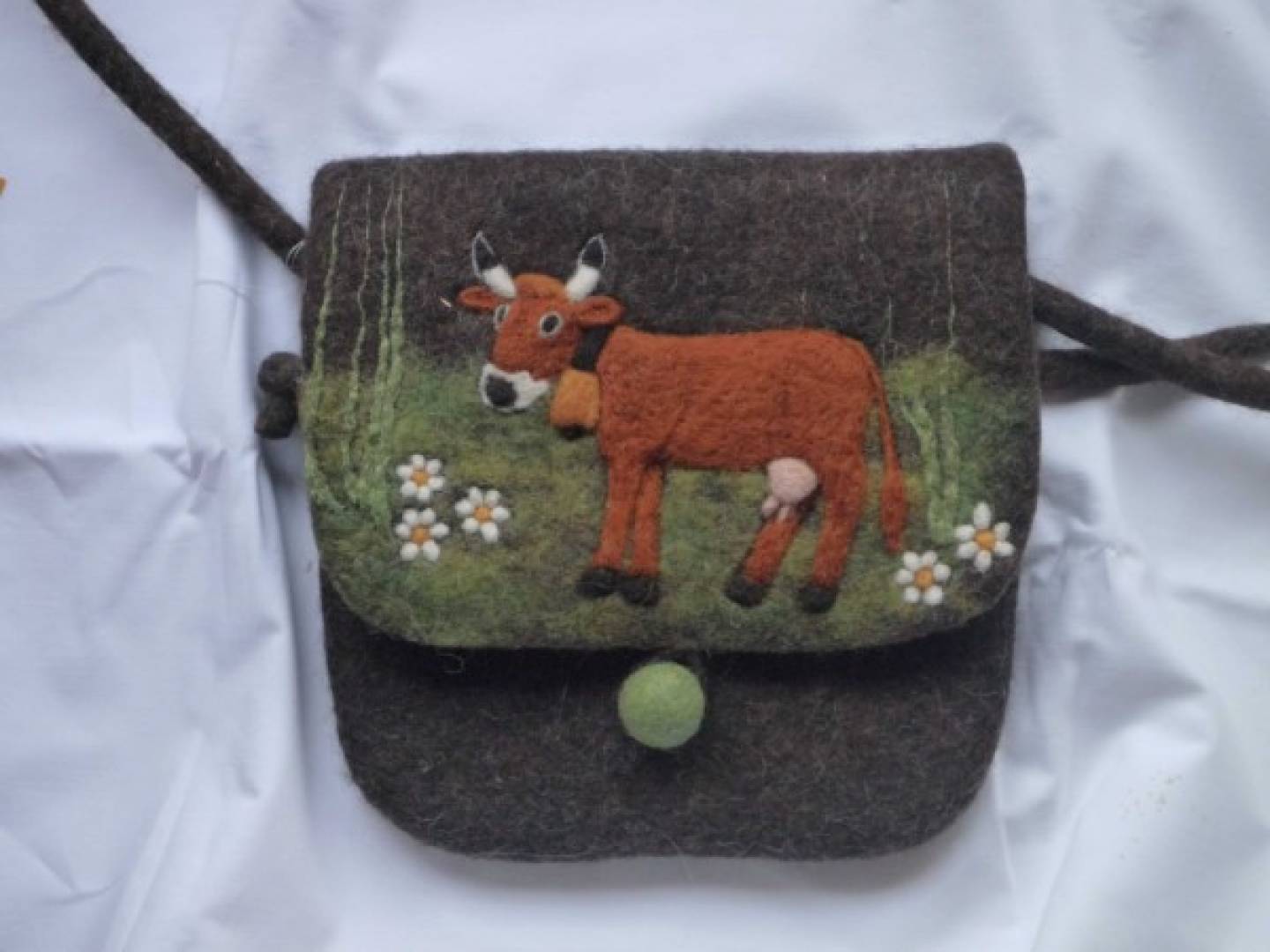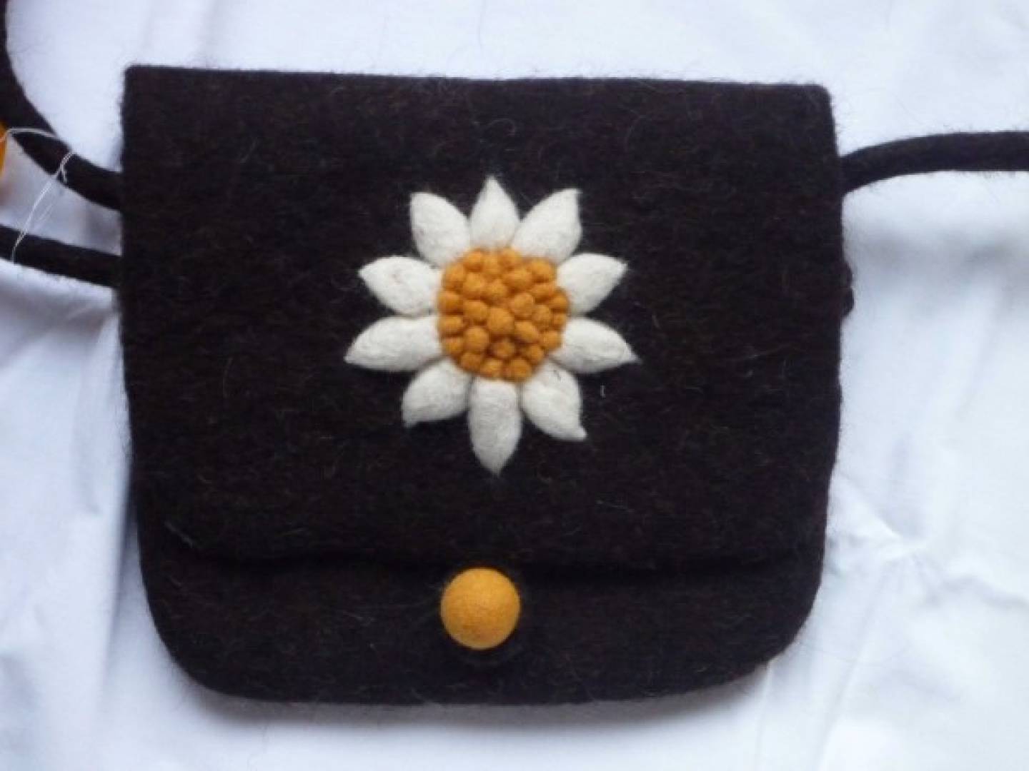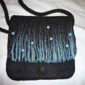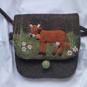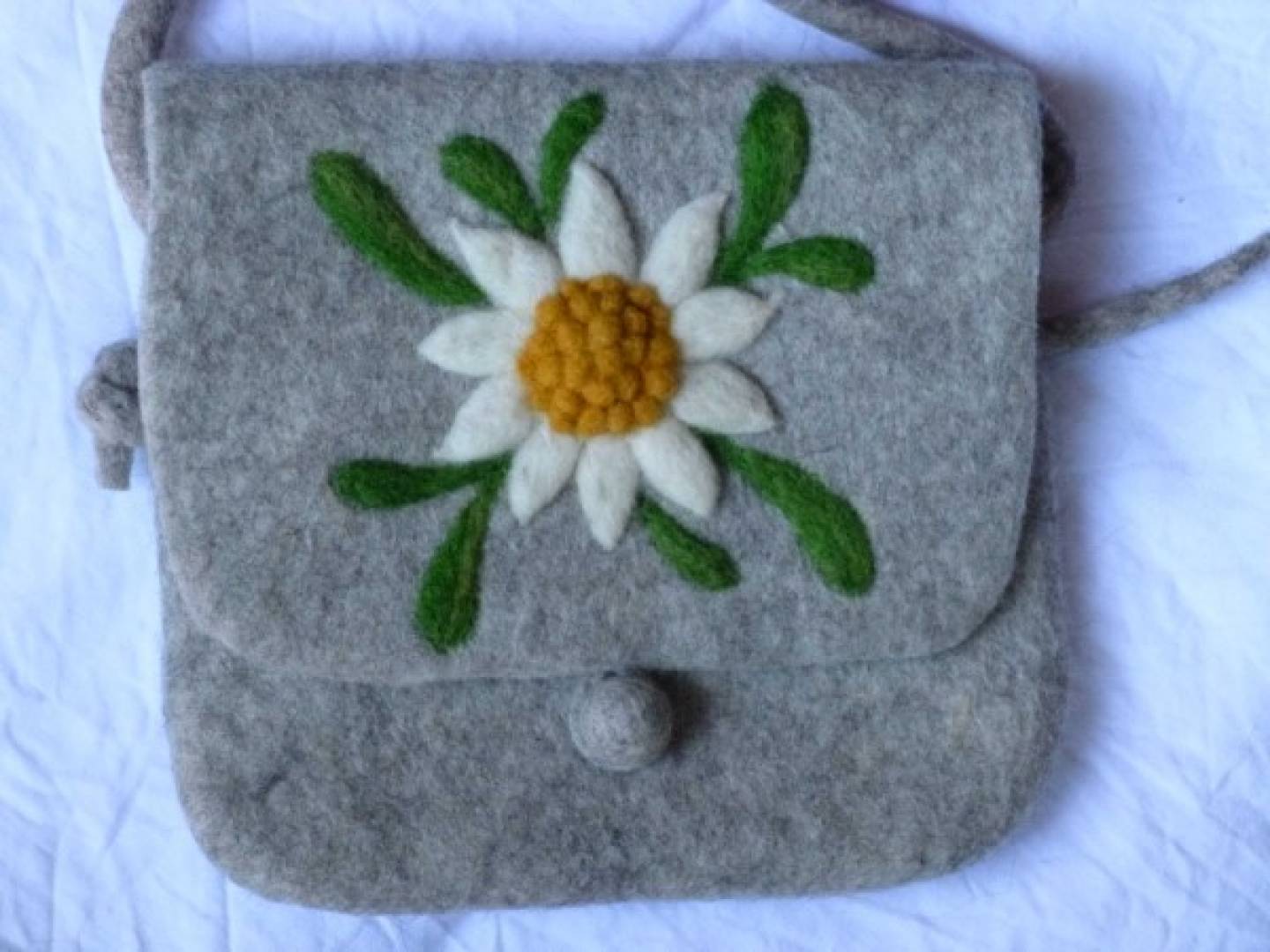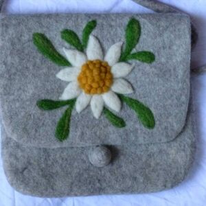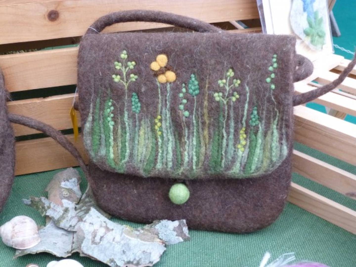 Meist aus heimischer Bergschafwolle filze ich Handtaschen, Sitzkissen, kleine Bilder zur individuellen Gestaltung von Kleidung oder Gebrauchsgegenständen, Dekoration fürs eigene Heim.