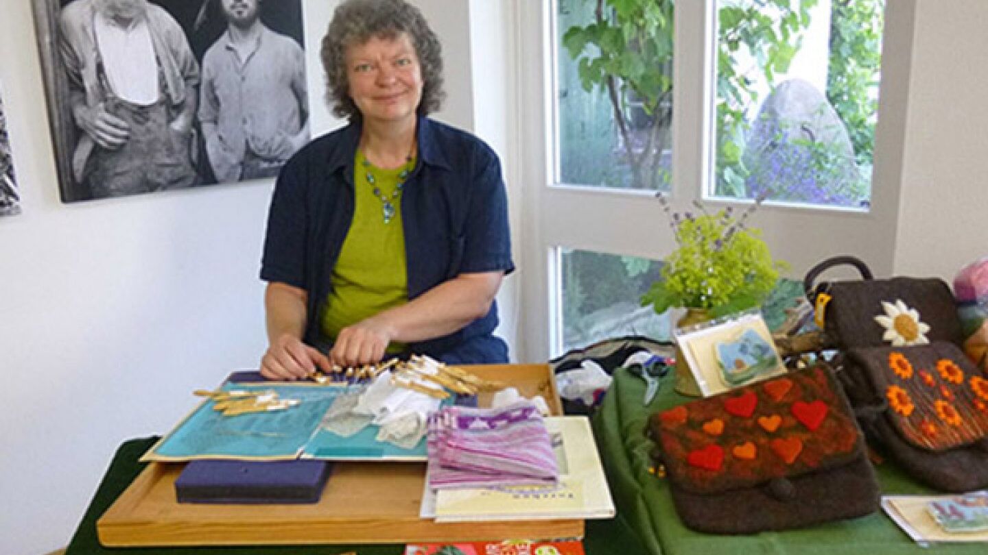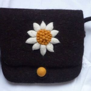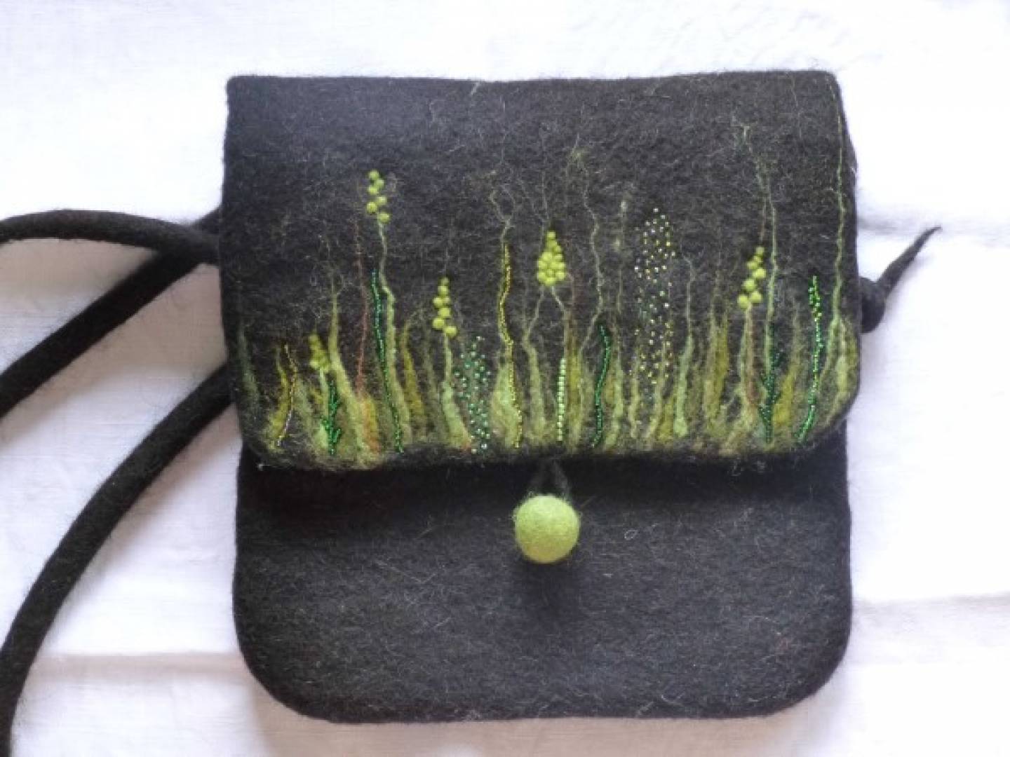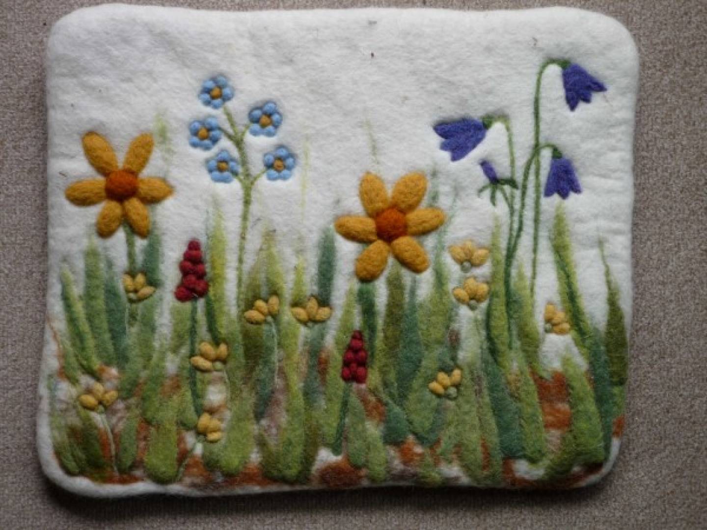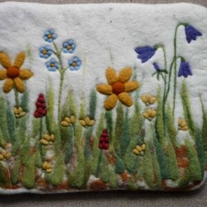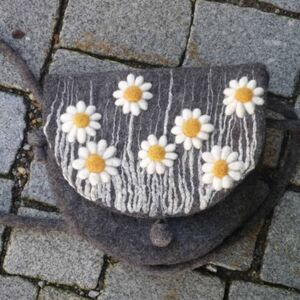Meist aus heimischer Bergschafwolle filze ich Handtaschen, Sitzkissen, kleine Bilder zur individuellen Gestaltung von Kleidung oder Gebrauchsgegenständen, Dekoration fürs eigene Heim.